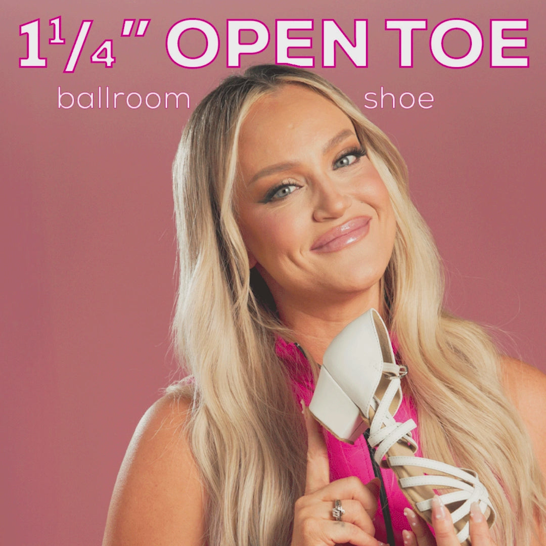 Welcome to the must-have open-toed Cuban heel from Lacey Schwimmer's ballroom shoe collection - perfect for every dancer regardless of age. With a cozy 1 1/4" heel, this shoe provides unbeatable comfort and stability for both practice and performances. Choose from three chic colors, including pink and white vegan leather, as well as authentic caramel leather. As part of Lacey Schwimmer's collection, each pair comes with an exclusive LS charm, adding a touch of elegance to your dance ensemble. Step onto the dance floor with confidence and flair in these fabulous Mambo heels.