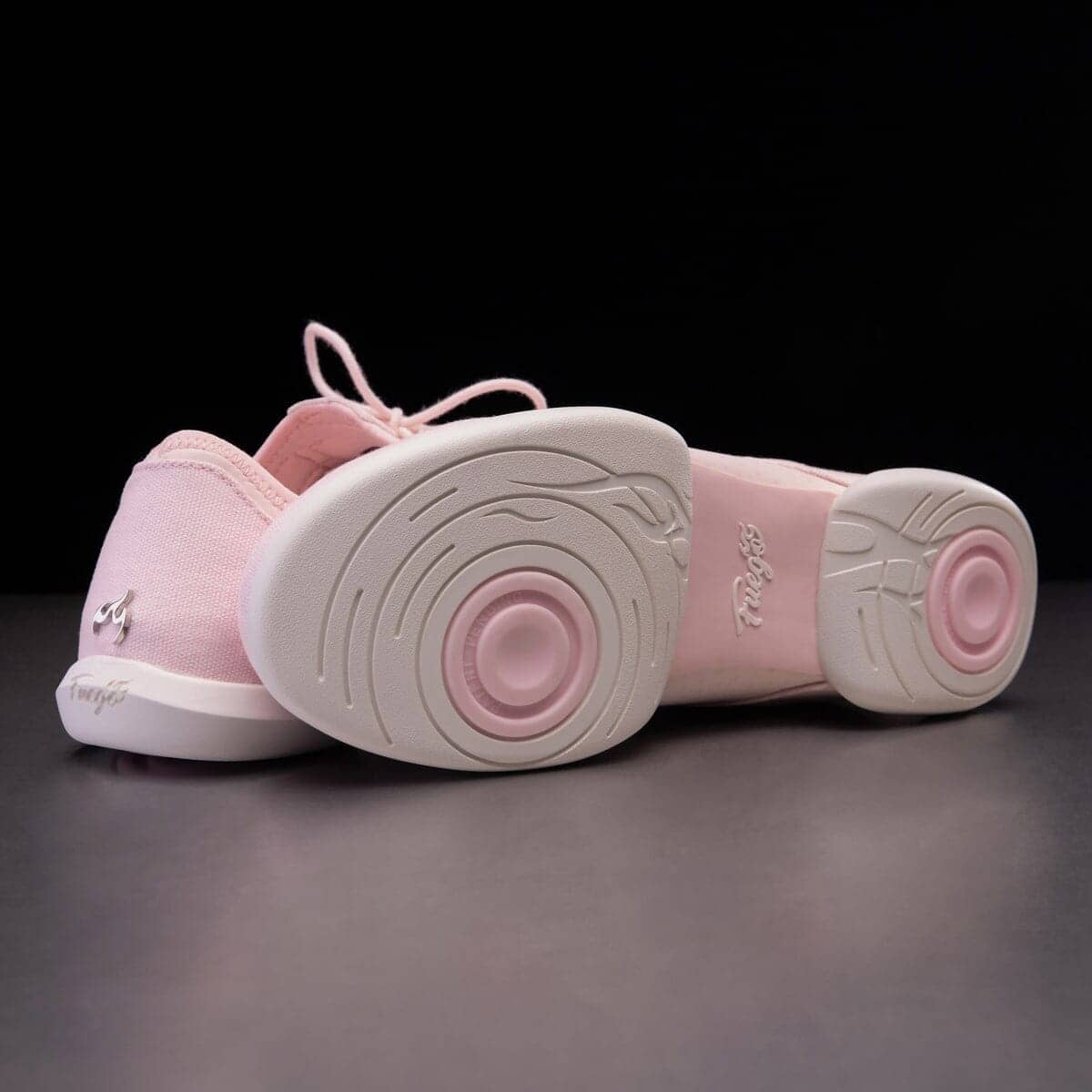 A pair of pink dance sneakers with split-sole design, featuring the brand name 'Fuego' on the sole and a silver flame design on the lace tips.