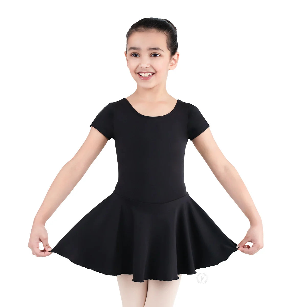 This short sleeve dance dress is made with incredibly soft and resilient Tactel® Microfiber, a material that is not only ultra comfortable but also holds color, shape, and softness wash after wash. Features include fitted short sleeves, a modest scoop neck and back, and an attached, matching Tactel® Microfiber skirt. The extended length of the attached skirt satisfies uniform requirements for American Ballet Theatre (ABT) curriculum. This leotard is fully front lined with Eurotard's unique odor-neutralizing, quick-dry material for superior comfort and coverage. This dance dress is perfect for studio dress codes and is available in 3 studio preferred colors: pink, lilac, and light blue.
