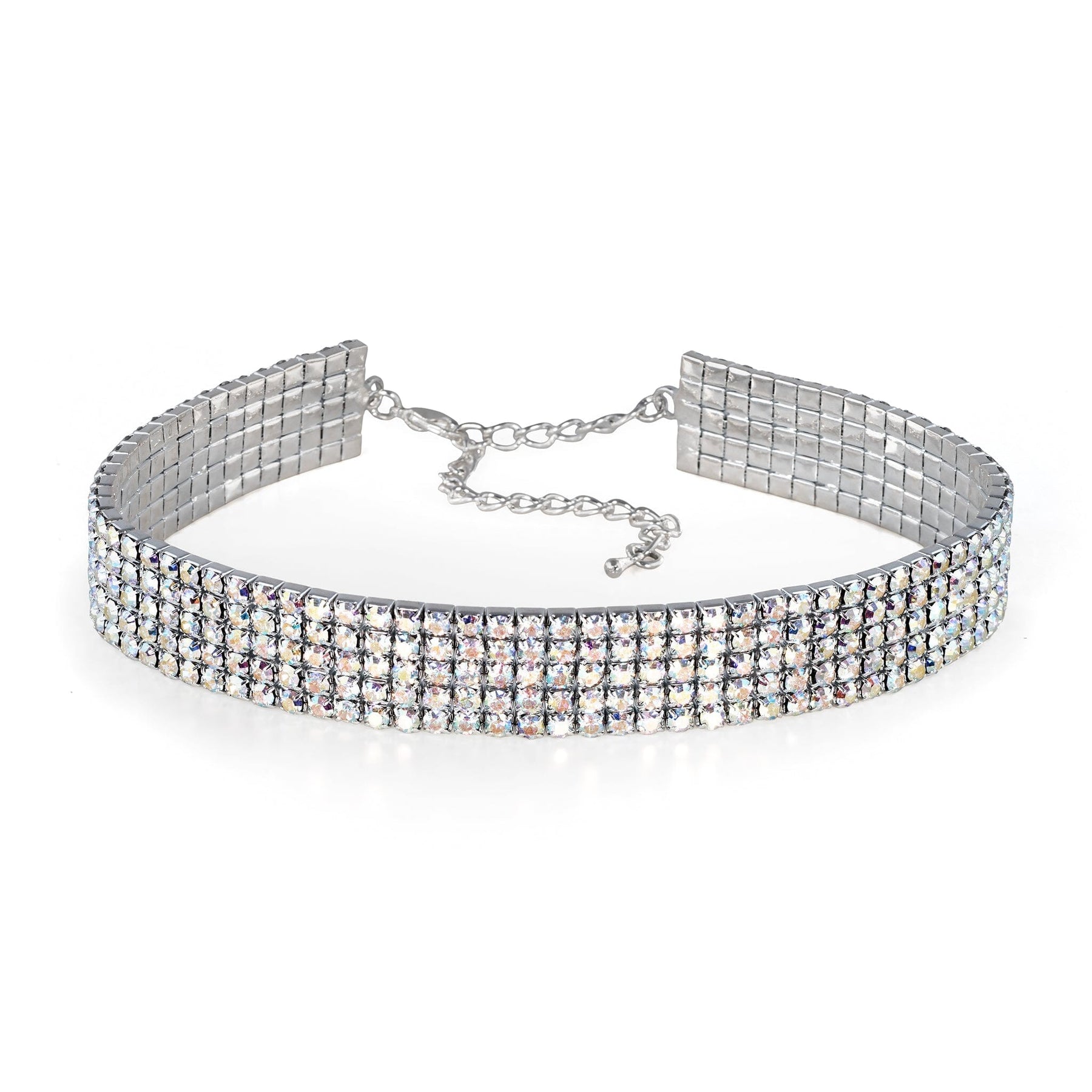 Silver choker necklace with clear crystals on a white background