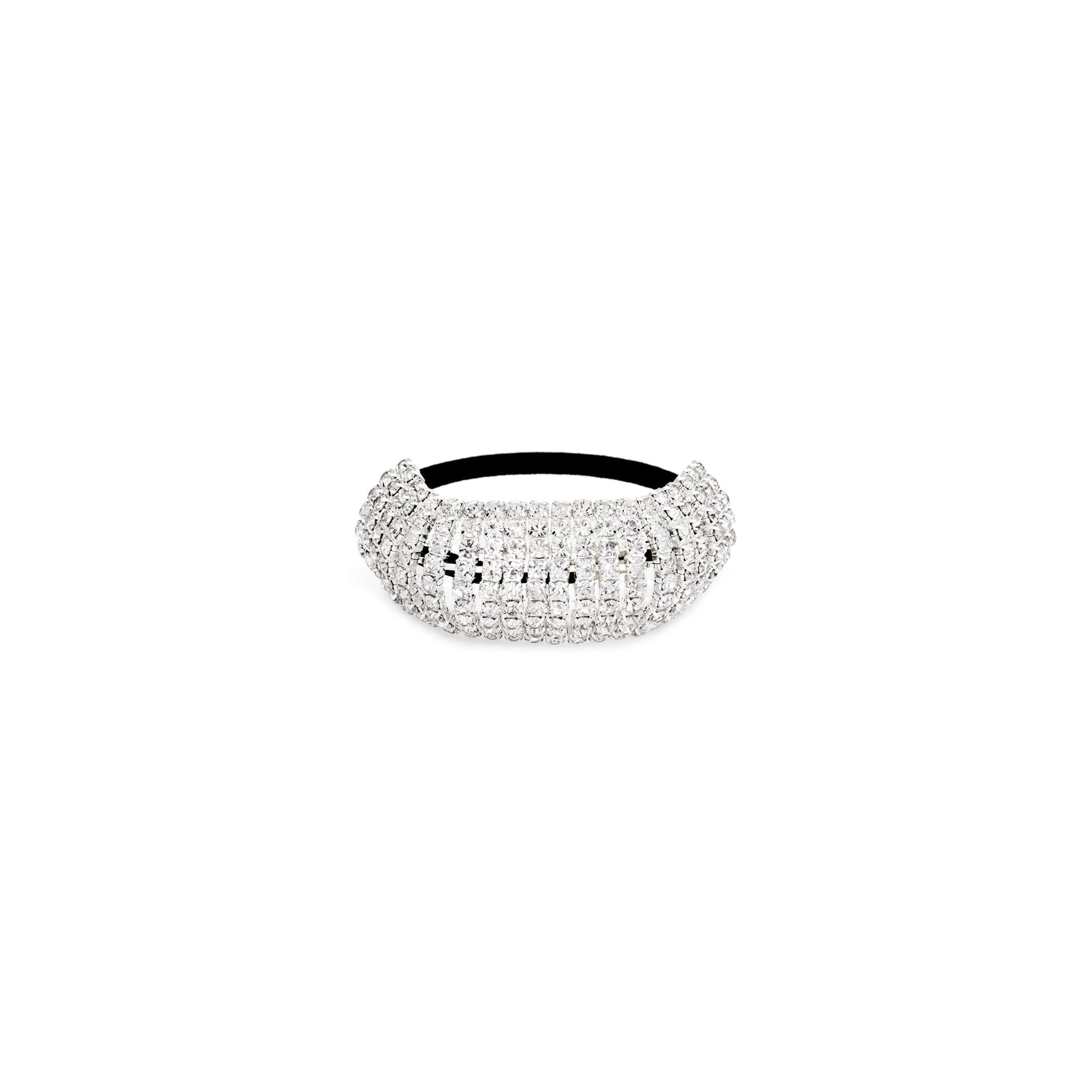 Flexi Wraparound Ponytail Elastic Band. The flexibility of our rhinestone pony holder makes this product a dancer favorite. 3"L x 1"H or 20 rows L x 9 rows H. Model is wearing 18mm celestial button earrings in silver.