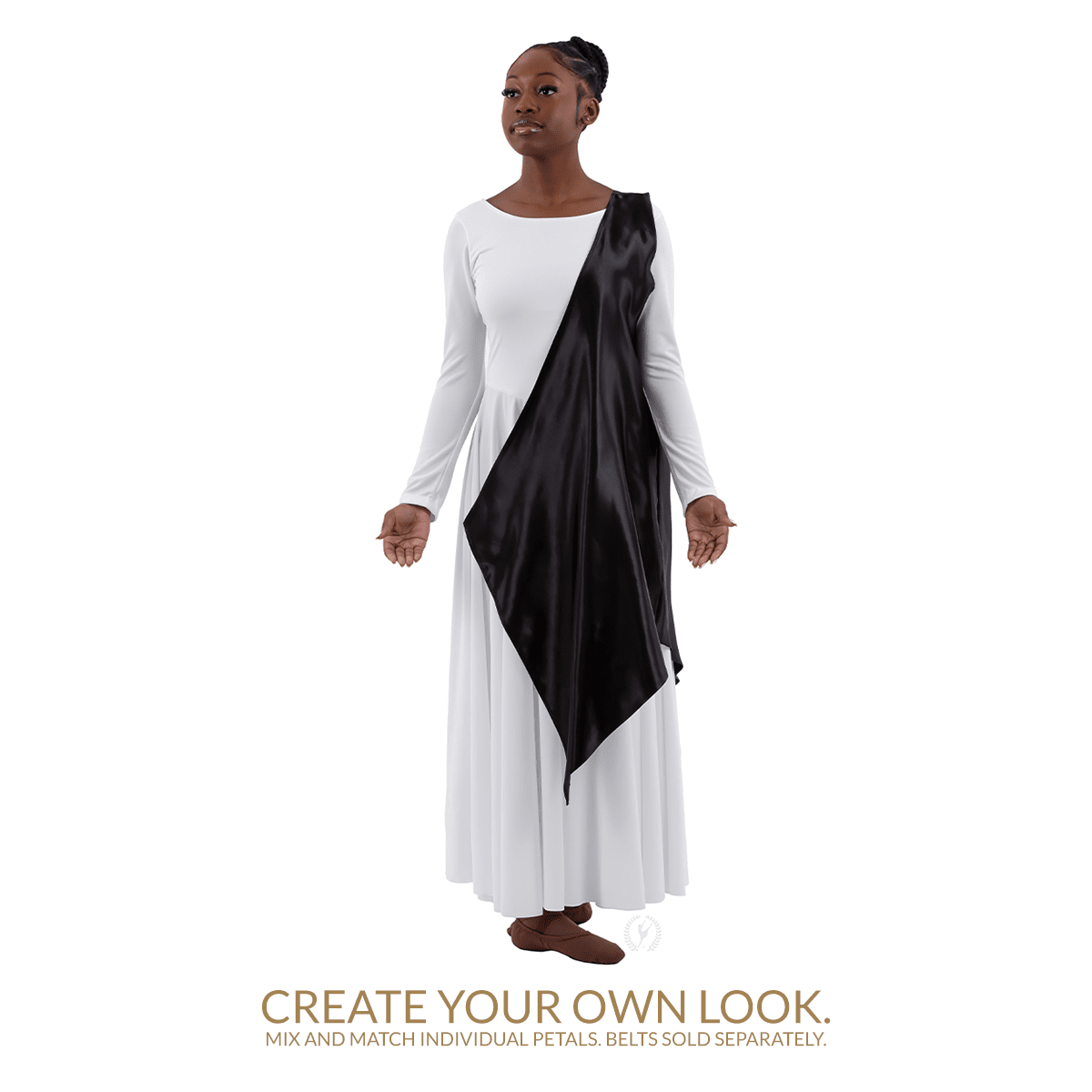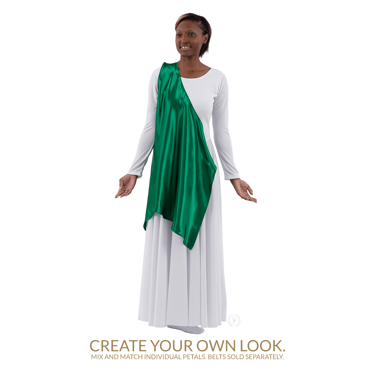 Single shoulder satin overlay. Petals may be worn alone with a belt or in pairs to create a full coverage overlay. PETALS SOLD INDIVIDUALLY. Mix and match colors as desired. A belt or tie is needed to secure the petals.