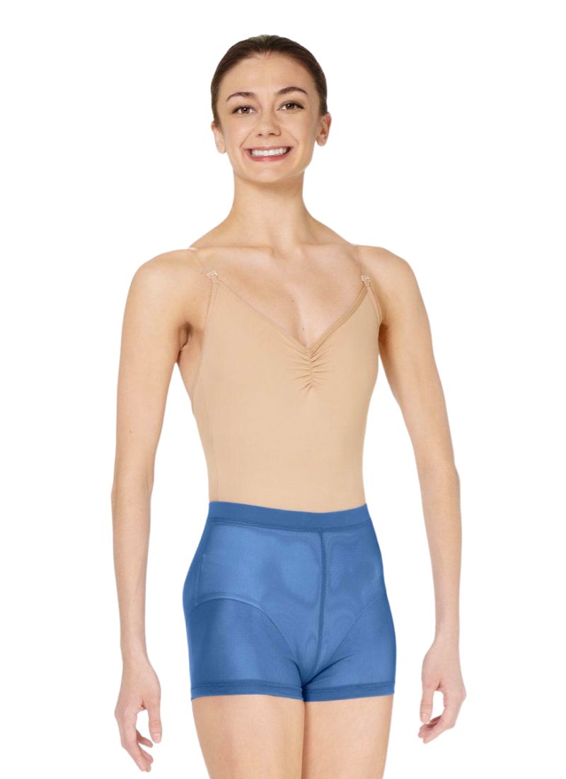 Womens "Raven" Mesh Shorts. These mesh shorts feature a 1 inch covered elastic waistband, and 1.5 inches inseam. Available in a variety of colors for perfect match to the leotards.