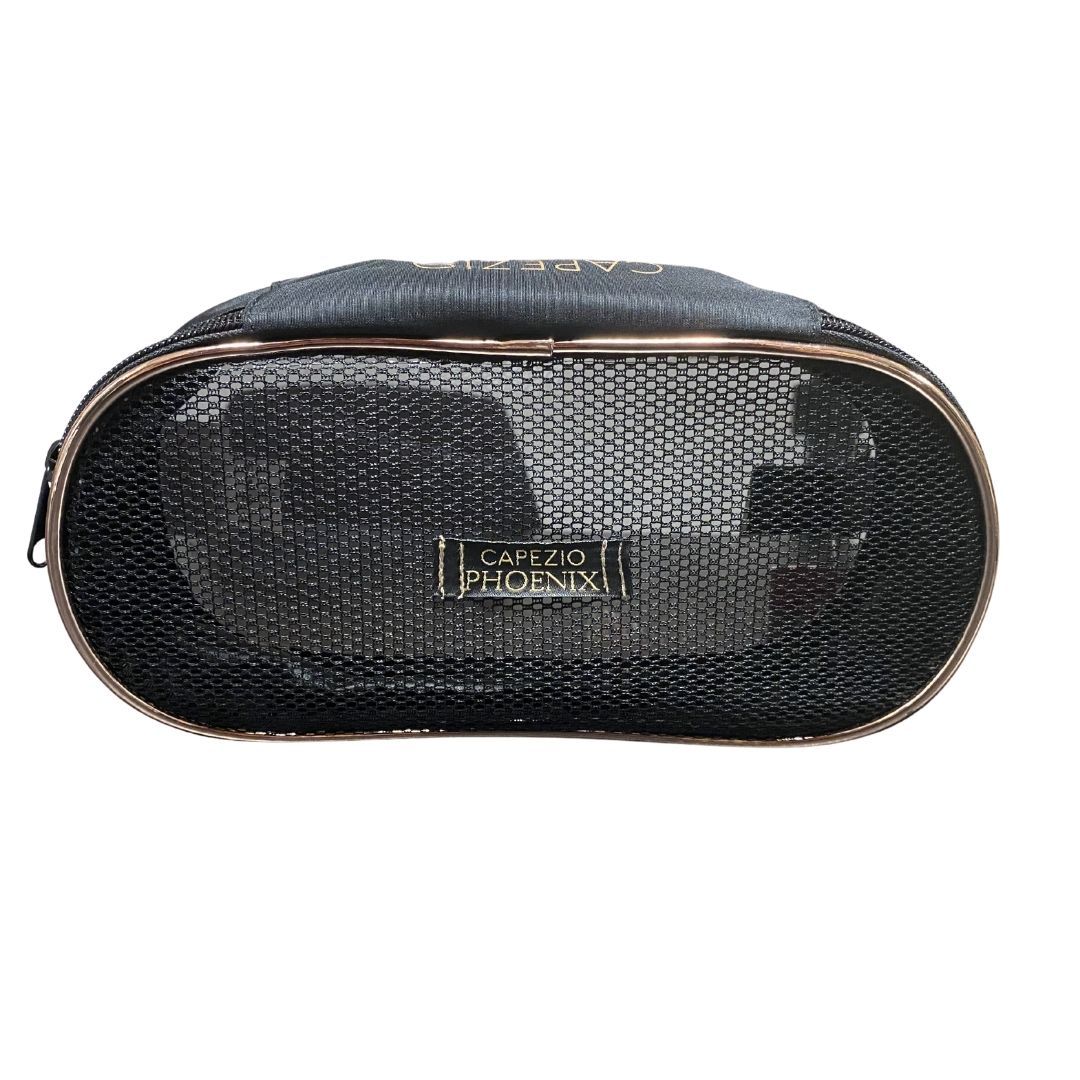 Sleek pointe shoe case with a clip can be used to attach the pointe shoe case to the outside of another dance bag. Features a gold “Capezio Phoenix” logo and mesh front for much-needed aeration.