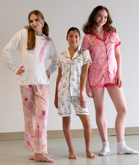 You're tired from dance, right? Covet is always here for you. These PJ's are a chic and playful tribute to dancers everywhere, and they're so soft you will never want to take them off! Perfect for sleepovers, summer intensives or just falling into bed after a long day at convention, these pajamas feature a fun bobby pin design and the words "Always Here For You" on the back of the top. Designed with a drawstring elastic waistband for maximum comfort and made from super soft silky fabric, they're the perfect blend of comfort and style.