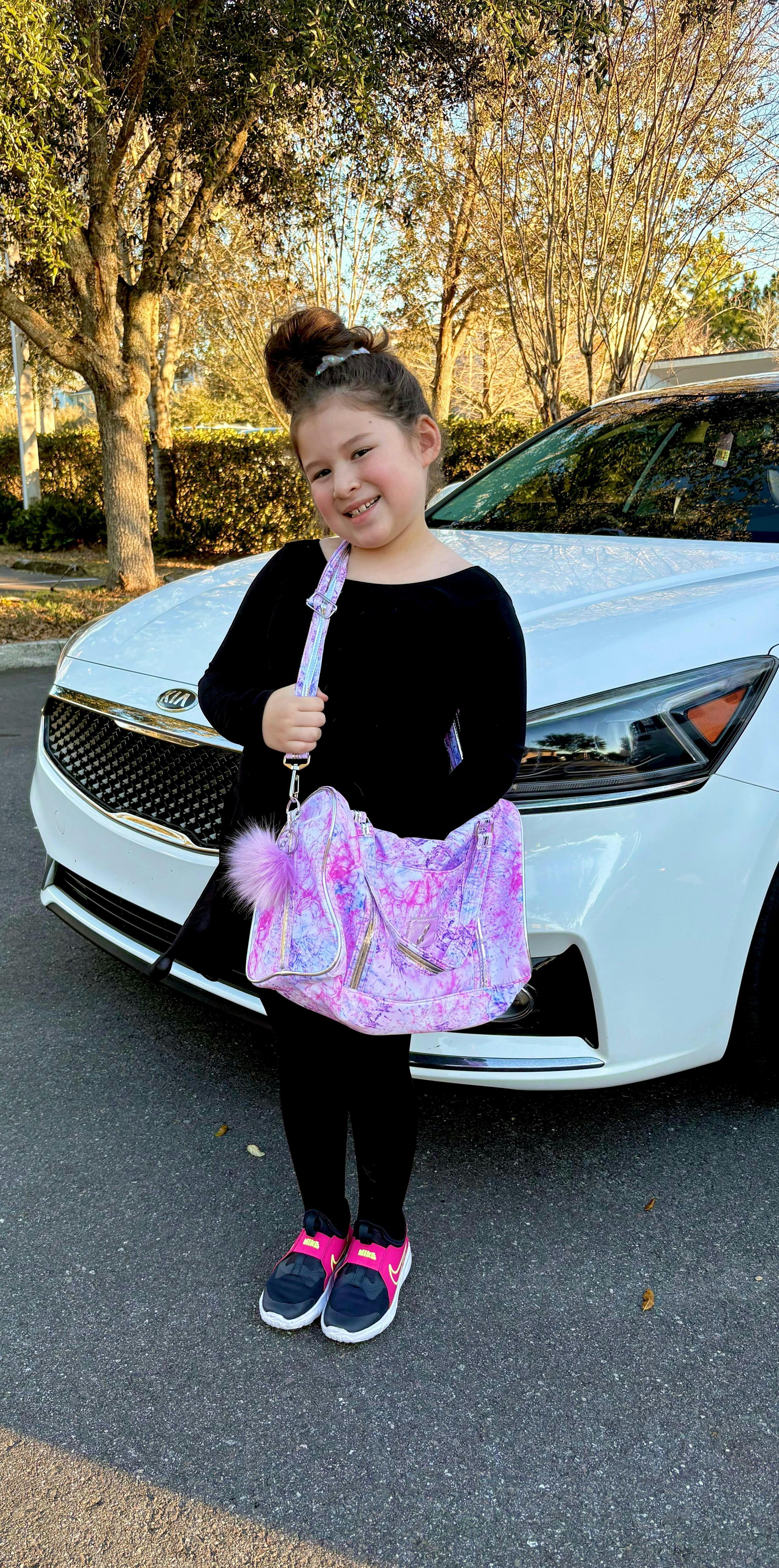 This roomy duffle will hold all your dance needs. A cool psychedelic swirl tie-dye design covers a soft and durable nylon exterior fabrication. Features include a front exterior pocket plus full length inside zipper pocket in addition to double handles and adjustable shoulder straps. Infludes matching pom-pom keychain. This bag wipes clean and folds flat.compartment for shoes or wet items. Three front pockets, two are roomy cargo pockets that zip closed. Comfortable carry straps and adjustable shoulder straps. Wipes clean and folds flat.