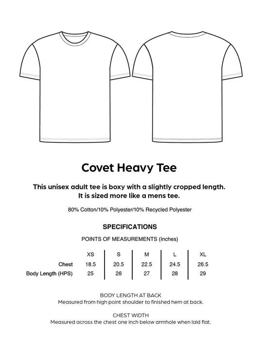 Premium, pigment-dyed, heavyweight 100% ringspun cotton crewneck t-shirt. The Covet Heavy Tee features a classic crew neckline, easy short sleeves, a slightly cropped length, and a boxy, relaxed fit. This tee will get softer and softer wear after wear.