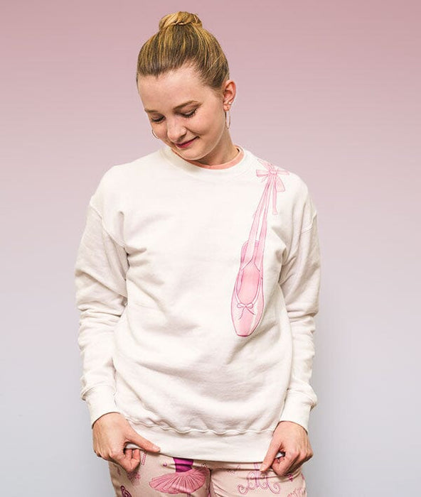 Dancers, get ready to drape yourself in comfort with a touch of ballet elegance! The Over the Shoulder Crewneck Sweatshirt is the perfect way to wear your love for dance—literally. Featuring a pretty illustrated pair of pointe shoes that “hang” effortlessly over your shoulder from the front to the back for a playful, artistic touch.