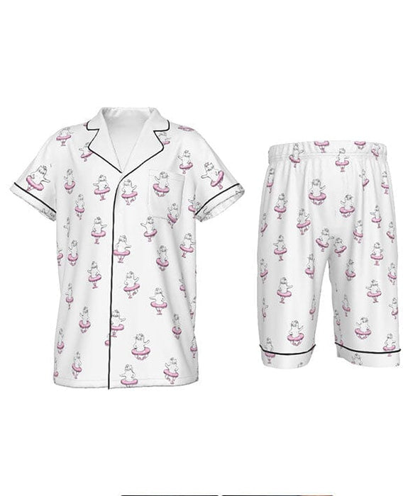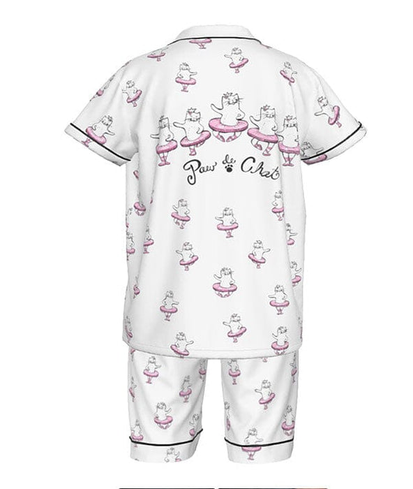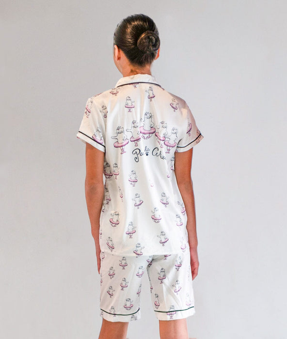 Attention, sleepy little ballerinas! We have the perfect ensemble for your next studio sleepover! These soft, silky pajamas feature the cutest dancing kittens doing their favorite ballet step, the PAW DE CHAT! When you get home after a long day of class, performance, or convention, this silky set is what you want to put on to catch some zzzz's.