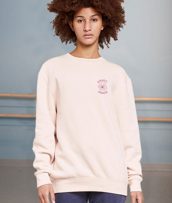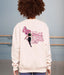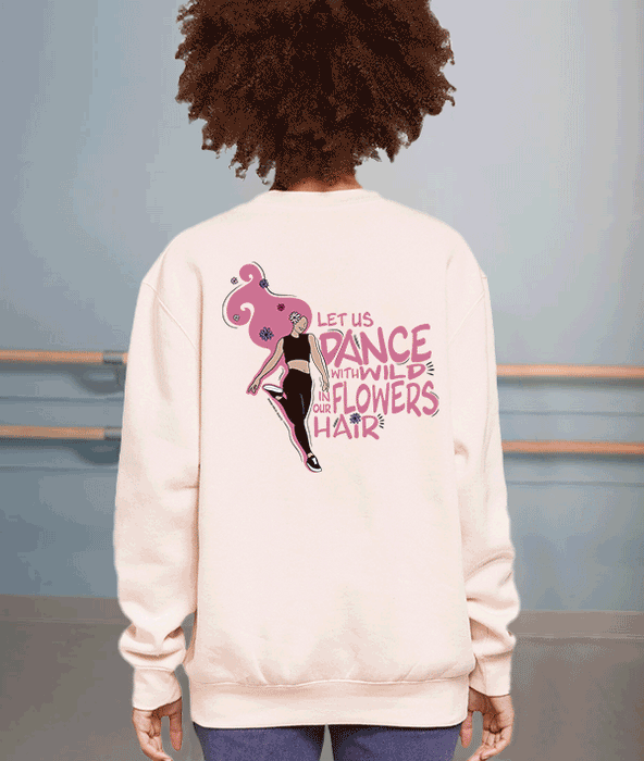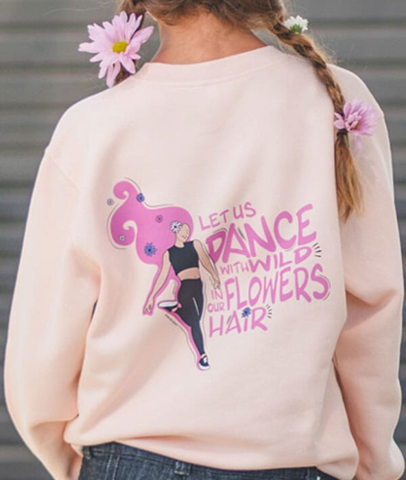 "Let us dance with wildflowers in our hair" quote by Susan Polis Schutz decorates this comfy crewneck. All dancers will feel like grooving in this unbelievably soft and pretty pale pink sweatshirt. Wear it to tap, ballet, or contemporary class at the studio, or rock it with your weekend jeans to show off your moves. This sweatshirt will become your go-to for warmup this year.